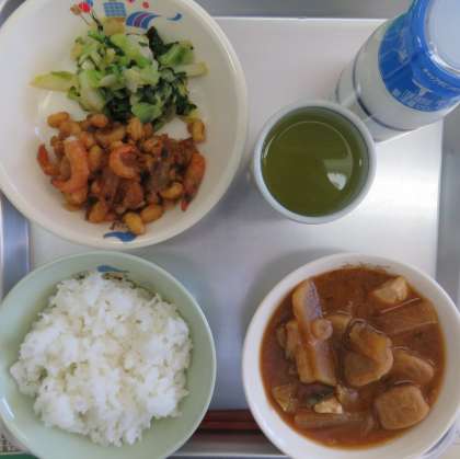 大豆と赤車海老の甘がらめ、江南野菜の和え物、アカモクのみそ汁、ご飯、牛乳