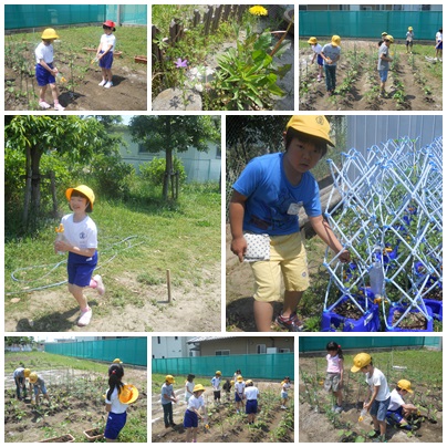 今日は朝礼があったため、長放課と昼放課の時間を使って野菜の水やりをしました。自分の野菜だけでなく、ほてっこ農園に植えてある学年の野菜にも水やりをしてくれている児童がたくさんいました。笑顔で教室に戻る児童たち。水をもらった野菜たちが、とても嬉しそうに見えました。