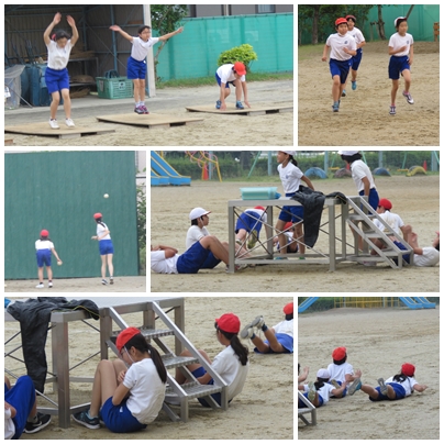 6年生が体育の授業の冒頭にサーキットトレーニングをしています。 走って、登って、投げて、跳んで、腹筋・背筋の筋力トレーニングと、全身を使った豊富な運動量が確保できます。 今のほてっ子は、親世代と比べても体力は落ちています。 こうしたトレーニングで、少しでも補充できればと思います。