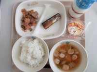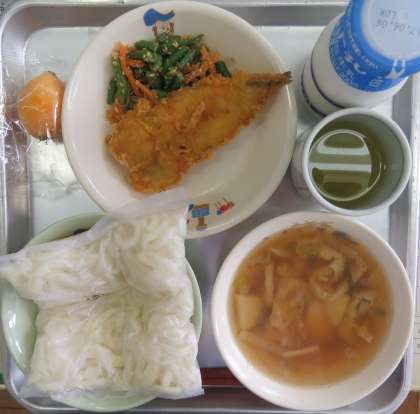 白玉うどん、にぎすの天ぷら、隠元のごま和え、ビワ、牛乳