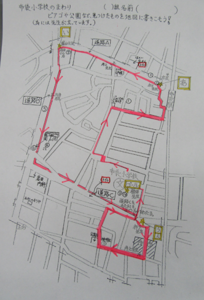 布袋小学校を出発し,北は布袋駅前の大通り,西は名草線,南は神明社前の道,東は鉄道の路線の内側をグループで地図を見ながら探検します。