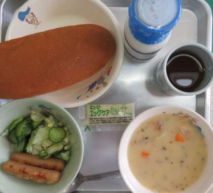 ロールパン、焼きウィンナー、チーズサラダ、乳玉子なしドレッシング、豆乳ポタージュ、牛乳