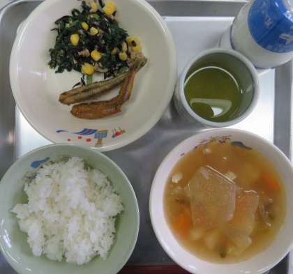 にぎすの米粉揚げ、ヒジキの和え物、冬瓜汁、ご飯、牛乳