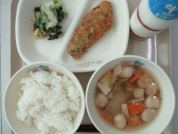 愛知の五目厚焼き玉子、ひきずり、江南小松菜のおかか和え、ご飯、牛乳