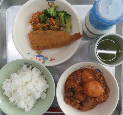 にぎすのフライ、みそおでん、ブロッコリーのおかか和え、ご飯、牛乳