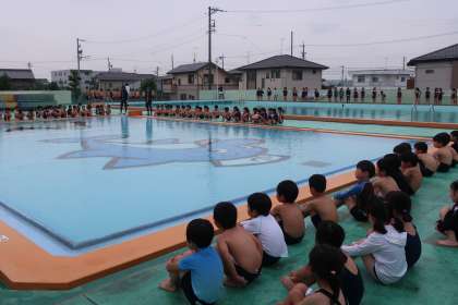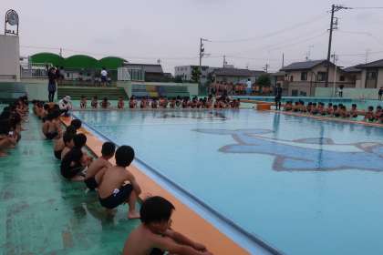 みんなが楽しみにしていた、小学校に入って初めてのプールです。気温も水温も問題なく、無事入ることができました。初回は学年全員で入り、みんなで楽しく浸かったり回ったり遊んだりしました。