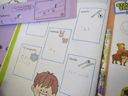 また,自己紹介カードにも,英語で文字を書いています。教科書のワードリストを書き写してがんばっています。