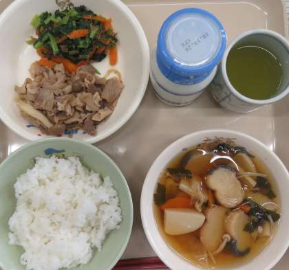 豚肉とキノコの炒め物、松茸麩のすまし汁、おかか和え、ご飯、牛乳