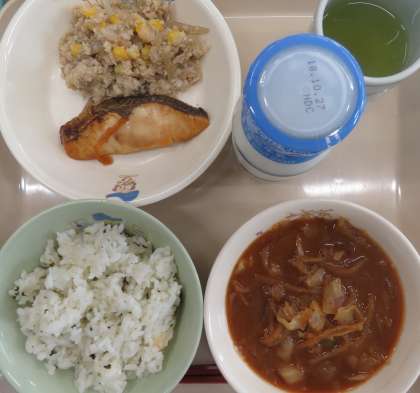 ぎんひらすの柚皮だれかけ、炒り卯の花、野菜丸ごと味噌汁、愛知の大根ご飯、牛乳