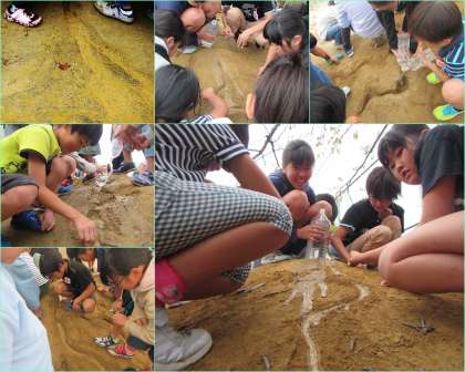 川が氾濫する様子,地面が削れる様子,土が運ばれる様子を観察しました。