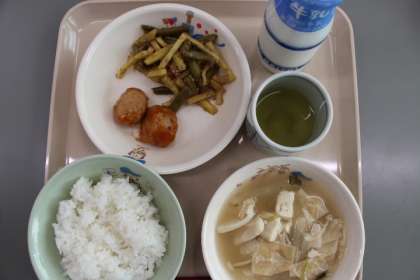 つくね、サツマイモとインゲンの甘辛きんぴら、湯葉のすまし汁、ご飯、牛乳