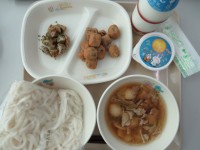今日の献立は、しらたまうどん・牛乳・つきみうどん・れんこんだんごのあまからに・...