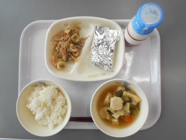 ごはん ぎゅうにゅう たらのみそマヨホイルやき ごもくきんぴら えびだんごじる 593kcal