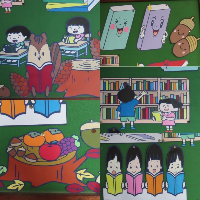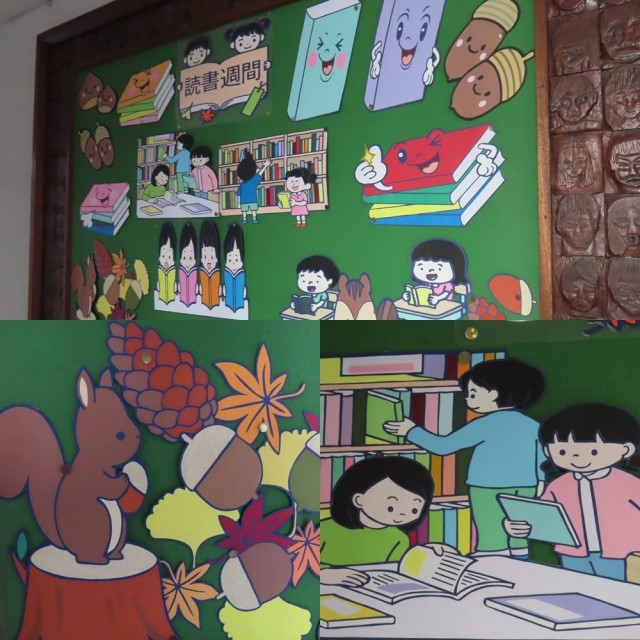 そんな「読書の秋」を切り絵にしていただき、校長室の横の掲示板に貼っていただきました。