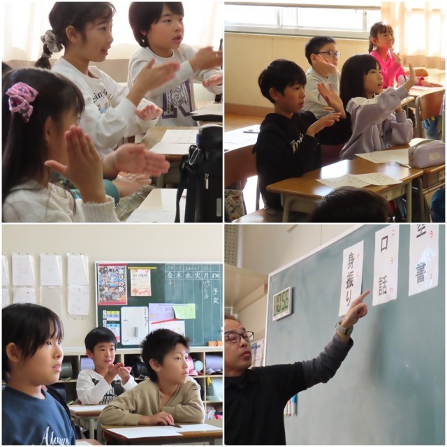福祉実践教室で、手話について学びました。聴覚障がい者の方に実際に来ていただき、手話だけでなく、筆談や口話などのコミュニケーション方法を聴きました。今後、手話を使ってみたいと思う児童や、手話でなくてもコミュニケーションを取れるということを知って、実際にコミュニケーションを取ってみたいという児童の姿も見られました。
