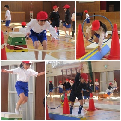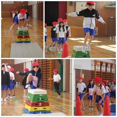 1年生の合同体育では、リズムダンスと跳び箱あそびをしていました。
