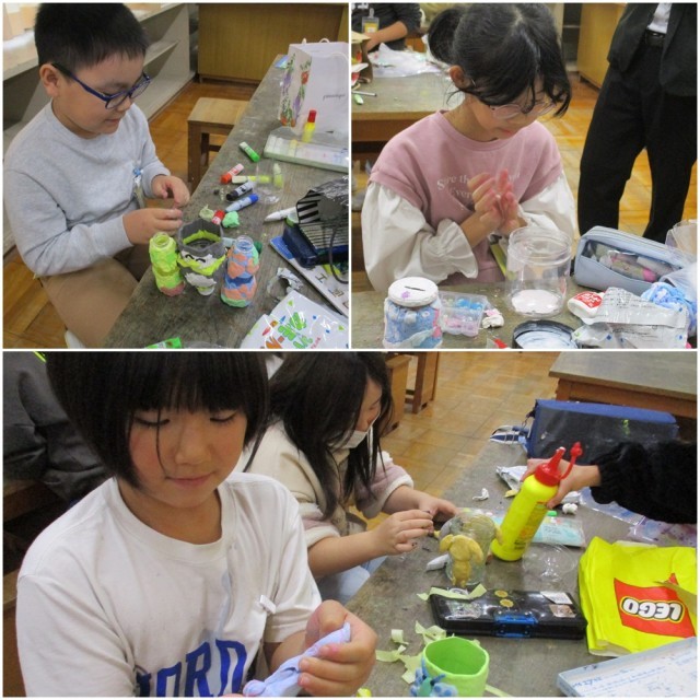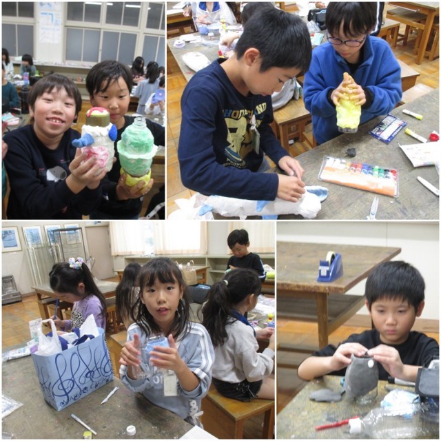 3年生は図工で、「空き容器の変身」の学習を行いました。色を付けた紙粘土を、容器につけていきます。紙粘土の色付けは、絵の具を粘土の中に入れて、こねました。ただの容器が、素敵な作品になりましたね。