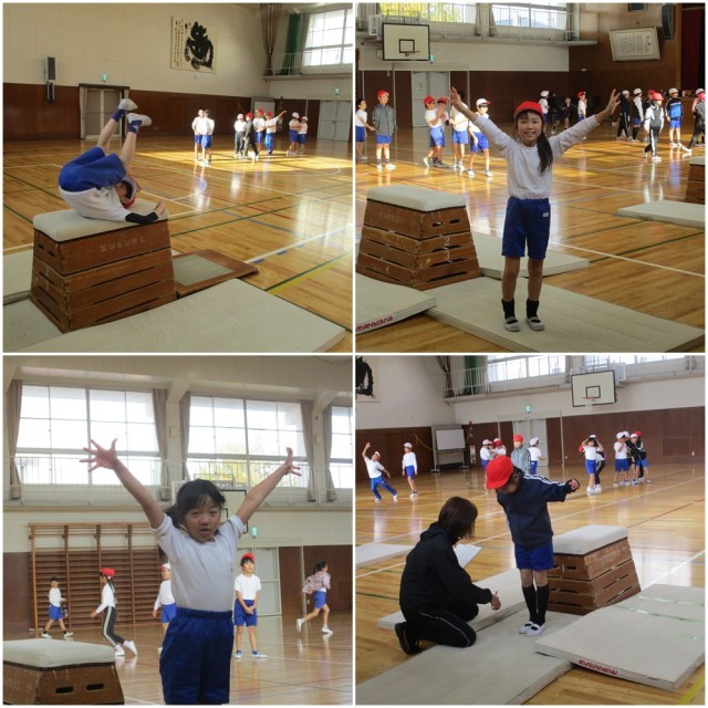 今日の学年体育の時間は、とび箱で台上前転の学習をしました。手をつく位置・頭がとび箱につく場所・着地、を意識して練習することができました。