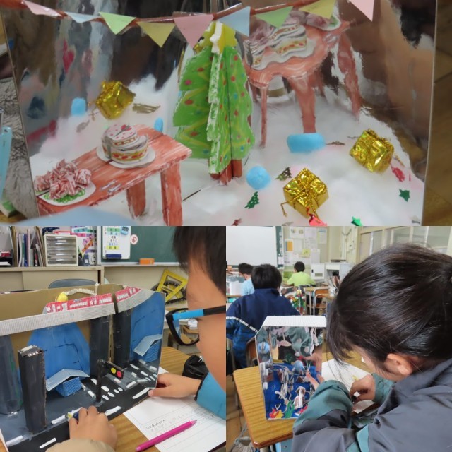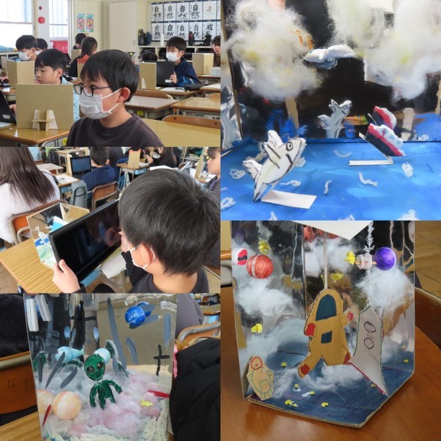学習用端末のカメラで、自分の作品を撮影し、工夫したところやよくできたところ等をふりかえりました。