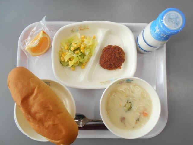 ロールパン ぎゅうにゅう ヒレカツ コーンサラダ はなやさいのシチュー いよかん 723kcal