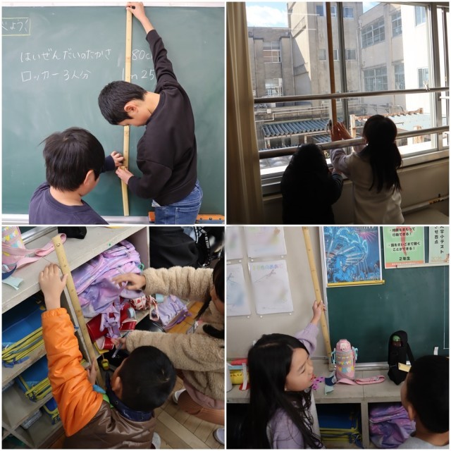 100㎝ものさしで教室のいろいろな物や場所を友達と協力して