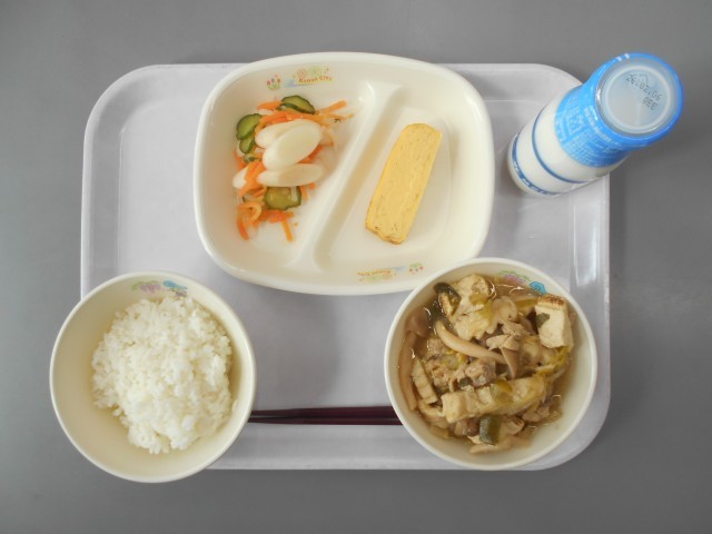 ごはん ぎゅうにゅう あつやきたまご ひきずり もりぐちだいこんのあえもの 657kcal