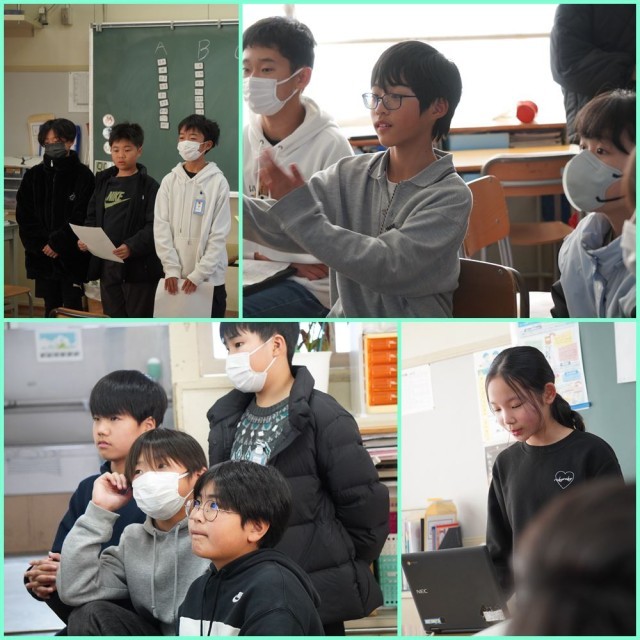 今日は、5年生を教室に招いて、6年生の発表を聴いてもらいました。(2組はクラスの仲間同士で発表をしました。)