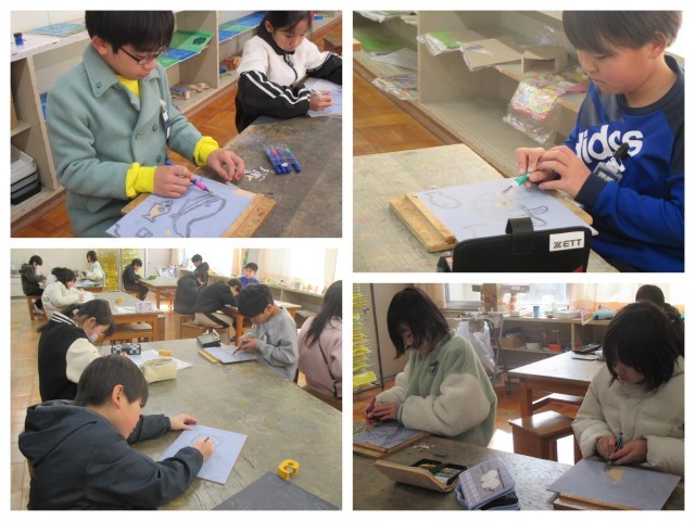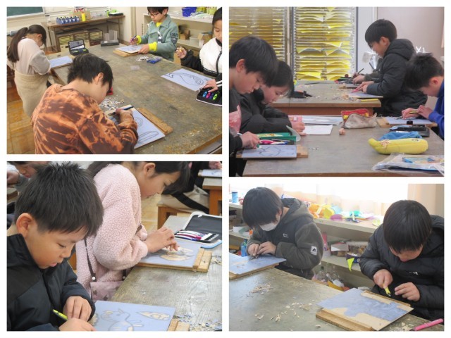 今日は図工の「ほってすって見つけて」の授業の中で彫刻刀を使った授業を行いました。初めての彫刻刀でしたが、彫刻刀の使い方を知り、いろいろな線や形が彫れることが分かり、「自分の作品にあった彫刻刀はどれだろう?」と考えながら彫ることができました。