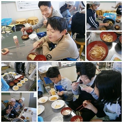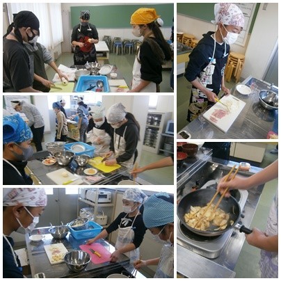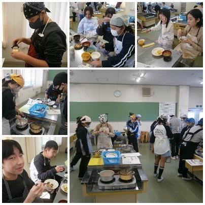 今までの調理実習の経験を活用し、ごはん、汁物、おかずを班で協力して作りました。事前に一人一人の役割や時間配分を計画したことで、どの班も時間以内に調理を終えています。今回はエコを意識して、水やガスを使いすぎないようにするための配慮もすることができました。