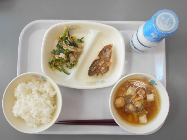 ごはん ぎゅうにゅう めばるのねぎしおだれ ちゃんこなべ さんしょくあえ 600kcal