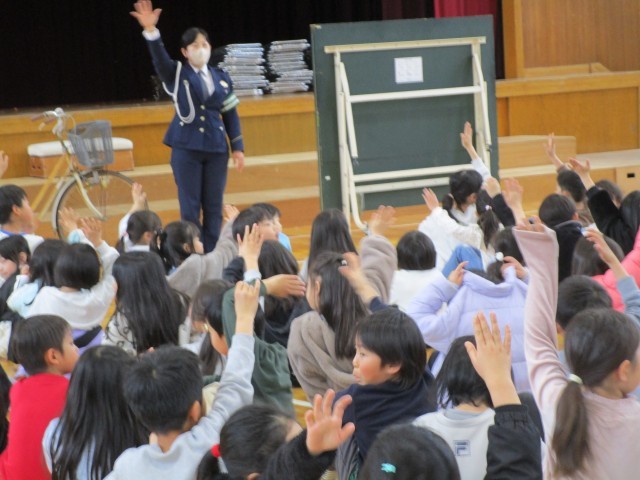 1・2年生合同で、交通安全教室が5時間目にありました。江南警察署の方から、自転車の安全な乗り方について話を聴きました。ヘルメットをきちんと着用し、被害者にも加害者にもならないよう、安全に自転車に乗れるようにしましょう。