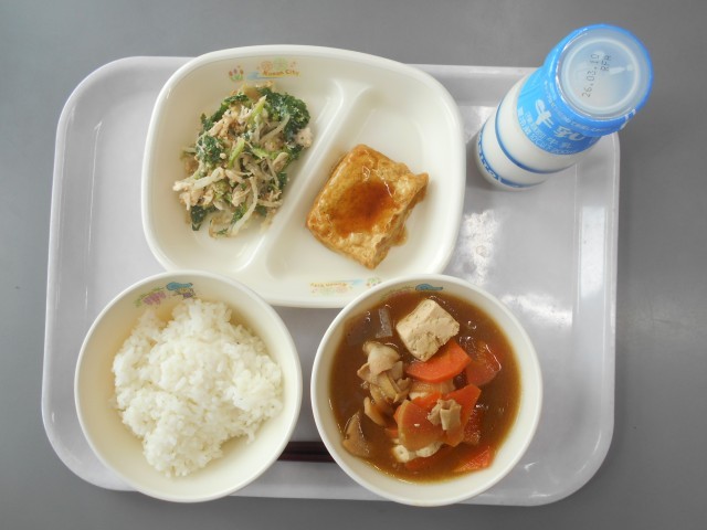 ごはん ぎゅうにゅう やさいいりしのだのしょうがあんかけ なばなのごまささみあえ こんさいたっぷりぶたじる 644kcal