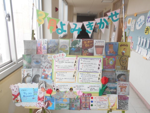 おはなしの栞(しおり)読み聞かせボランティア 本の紹介ボード3月