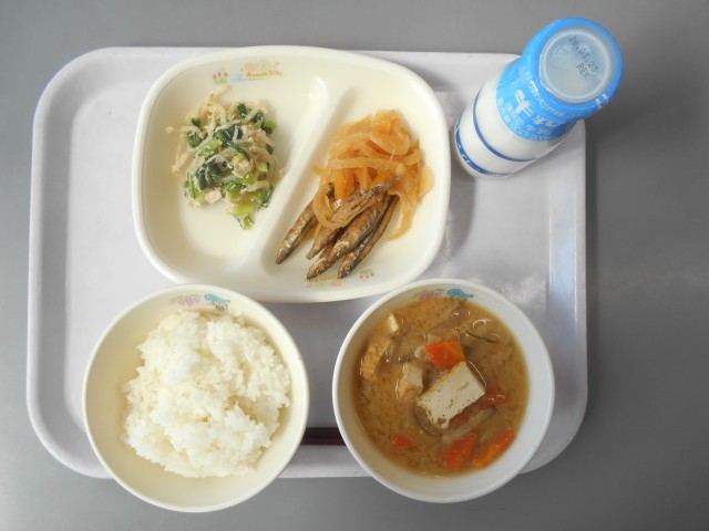 ごはん ぎゅうにゅう きびなごのなんばんづけ こまつなのささみあえ ごじる 587kcal