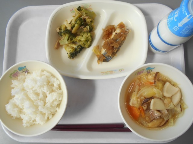 ごはん ぎゅうにゅう さわらのたまねぎソース ブロッコリーのにんにくいため あいちやさいのとろみじる
