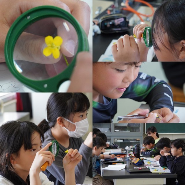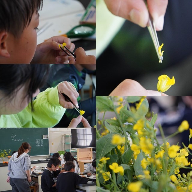 今日は、アブラナの花のつくりを調べる授業です。