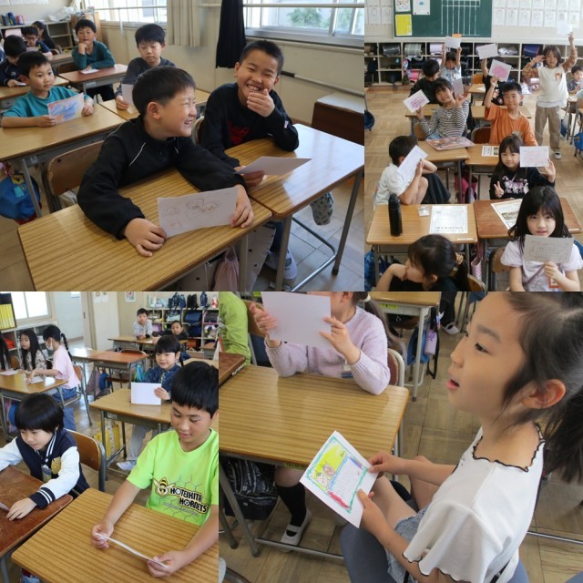 ペア学年の4年生と2年生でペア名刺を交換しました。初めて顔を合わせたペアの子と緊張しつつも楽しそうに話す様子が見られました。この1年を通して、ペアで行う行事だけでなく、普段の生活でも仲を深めていけるといいですね。
