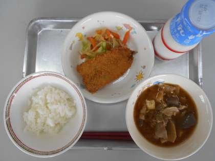 毎月19日は食育の日です。愛知県の渥美半島の沖合で漁獲されたにぎすをフライにしました。姿・形がきすという魚に似ていることから、にぎすと名付けられました。(南部学校給食センター発行「5月分献立表」より)
