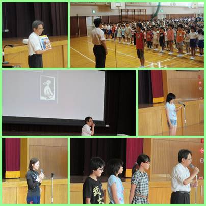 朝礼を行いました。今日は、昨年度PTAで買っていただいたおもしろそうな児童図書を校長先生が紹介してくださいました。その後、3名の6年生の代表児童がお薦めの本を紹介しました。