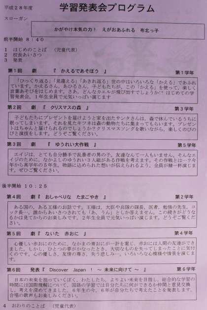 11月19日土曜日に行われる学習発表会のプログラムです。「かがやけ本気の力! えがおあふれる 布北っ子」のスローガンのもと、児童全員が一生懸命練習に取り組んできました。ぜひご参観ください。