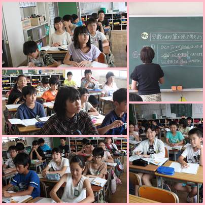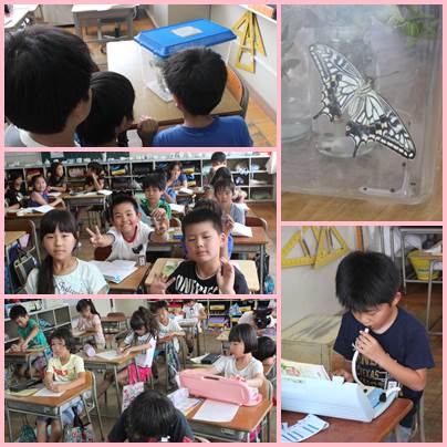今日の授業の様子です。6年生は2クラスとも算数で分数の割り算の勉強をしていました。分数の割り算は難しい内容ですが、理解できるようしっかりと頑張りましょう。3年生は理科のチョウの成長の勉強をしていました。ちょうど1匹がサナギからアゲハチョウになり、みんな興味深そうに観察していました。2年生は、ピアニカの学習、4年生は習字と算数の勉強をしていました。5年生は、自分の感想をプリントに書いていました。
