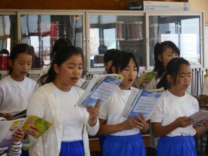 5年生は、片山先生に「ハローシャイニングブルー」という合唱曲を教えていただきました。