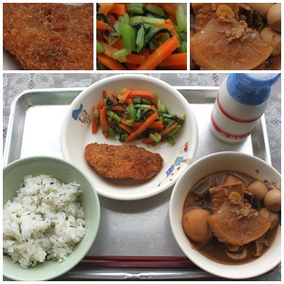 今日は食育の日の献立です。青じそは、愛知県が収穫量全国一位の野菜です。薬味としての利用が多いですが、今日はあじと一緒に一枚丸ごと揚げました。(南部学校給食センター発行「10月分献立表」より)