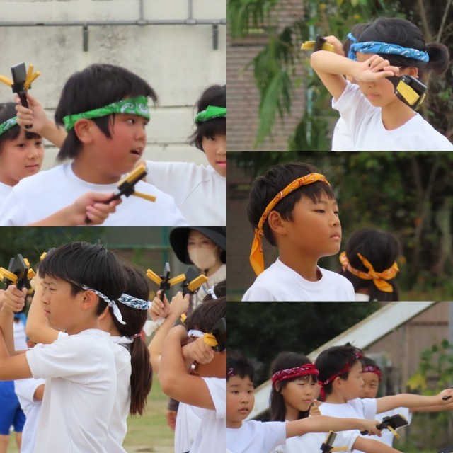 3・4年生は、各学級でバンダナの色をかえて、ねじりはちまきをつくります。