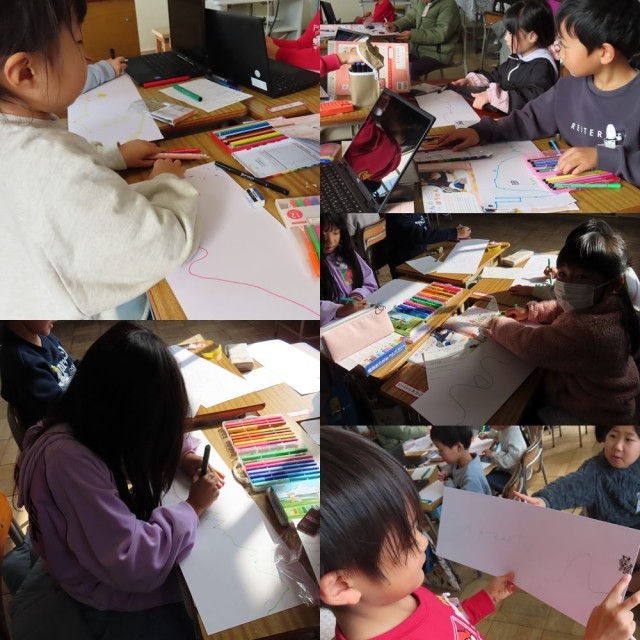 一本の線をかきながら思いついた冒険物語を絵に表します。