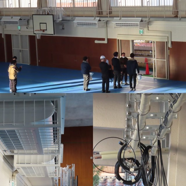12台のエアコンが体育館に設置されている景色は圧巻です。