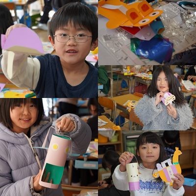紙で開いたり閉じたりする仕組みをつくることを知って、動きからイメージした形や色を飾り付け、遊んで楽しむ授業です。 かえるの口が「パクパク」、うさぎの耳が「ピョコピョコ」、紙で動く仕組みです。