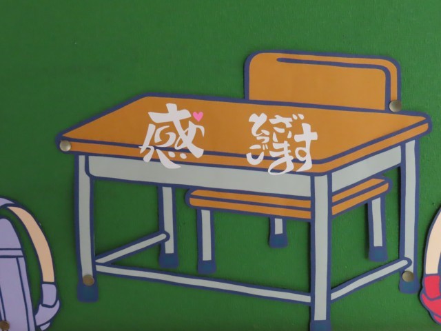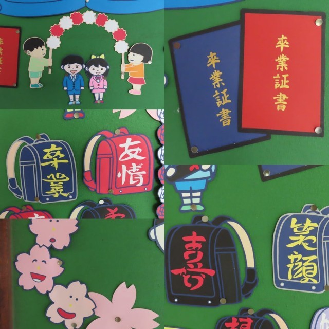 「卒業式」をテーマに切り絵にしていただき、校長室の横の掲示板に貼っていただきました。