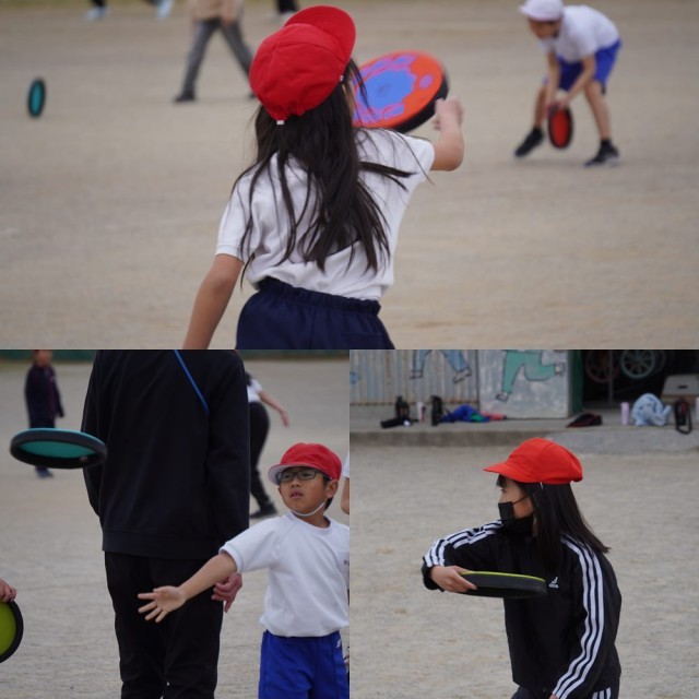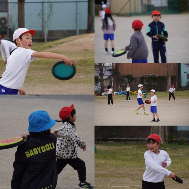 体育で「ドッヂビー」を使って「なげる」運動です。