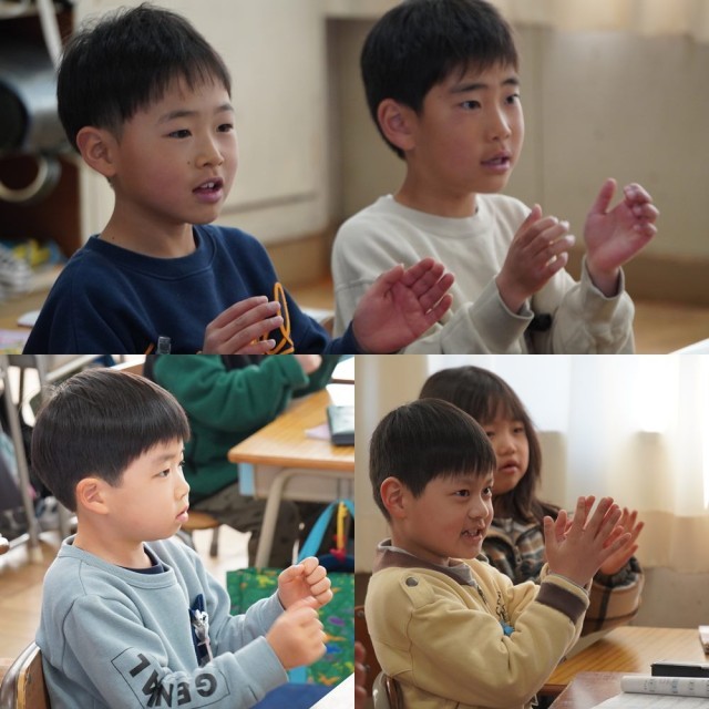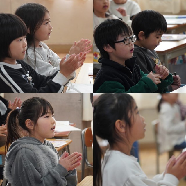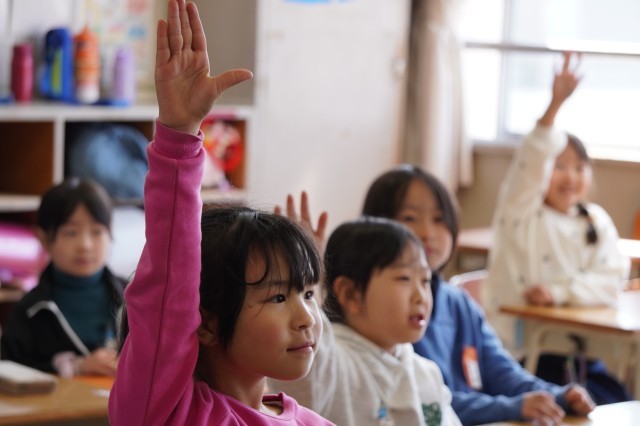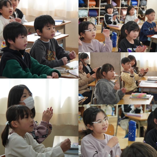 1年生の授業で、「わたしが つたえます」と手をあげる布北っ子。